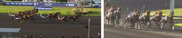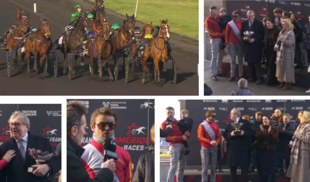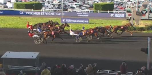 Today’s Prix de France undercard at Paris-Vincennes was a good one featuring three groupe level contests for four, five and six year olds. The Prix Louis de Bourg (monte Gr II, purse 120,000€, 2850 meters, 10 starters four year olds) started the affair with victory to 12/1 oidds Mojito Fraise(4m Bird Parker-Fraise Tagada)with Benjamin Rochard in the irons for conditioner Marc Sassier and Ecurie JR.