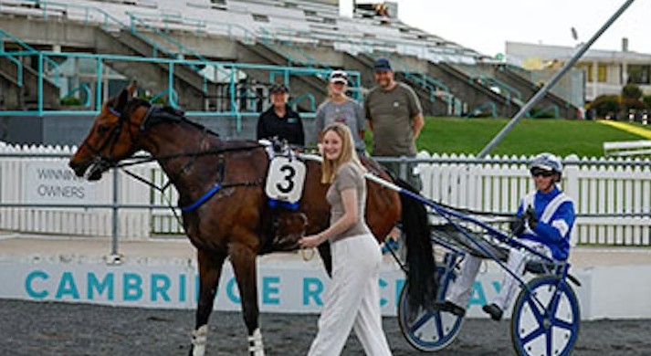 The team’s first success of the evening came courtesy of Conrad H in the Hire A Venue At Cambridge Raceway Mobile Pace. With Brooke Wilkins in the sulky, the gelding settled into the one-one early in the 2200m trip, and the pair travelled sweetly until the home turn, where they unleashed and swept past their rivals to win by a neck.
