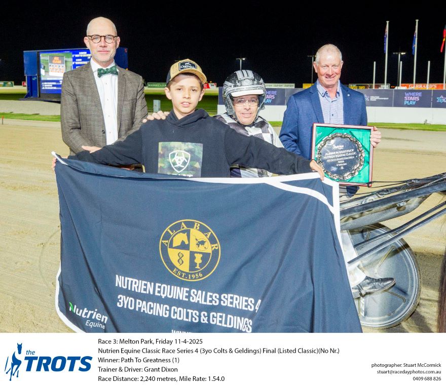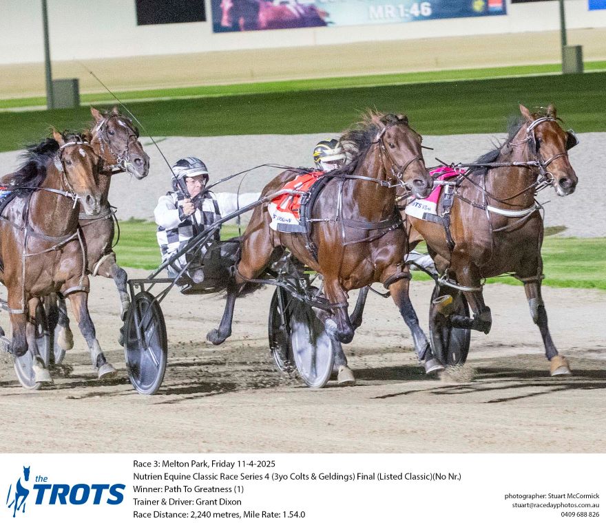Queensland harness racing visitor Path to Greatness (Captaintreacherous) lived up to his promise when he led all the way to take out the Listed $125,000 Nutrien Equine Classic final for three year old colts and gelding at Melton on Friday night.