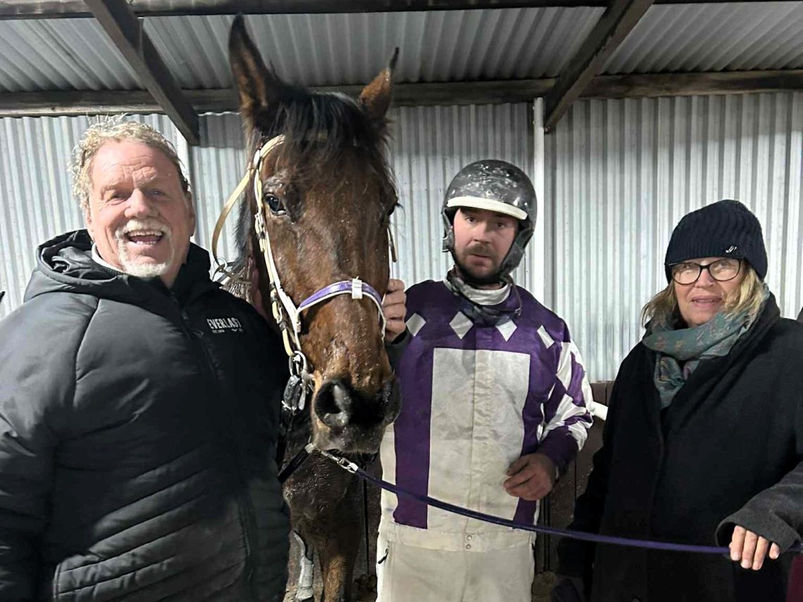 Barry and Katrina Ainsworth with their son Ashley after the emotional win by Ikara (Victorian Square Trotters Association photograph)