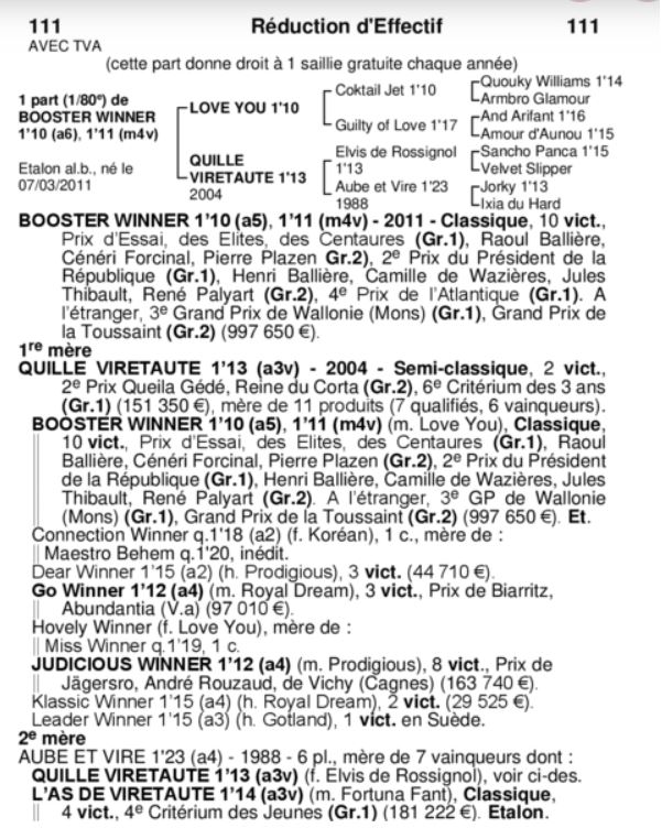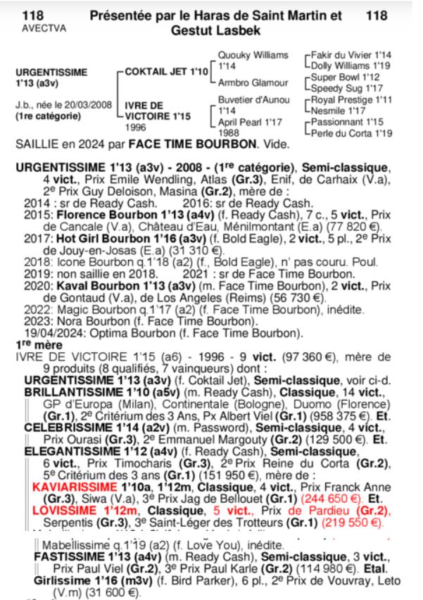Of those sold lot 118 Urgentissime (17f Coktail Jet-Ivre de Victorie) led the way ay 50,000€ to SAS Trotting Bloodstock, she open to a breeding to Face Time Bourbon. The other toppers were stallion shares to Horsy Dream and Booster Winner, with the pedigree pages as follows: