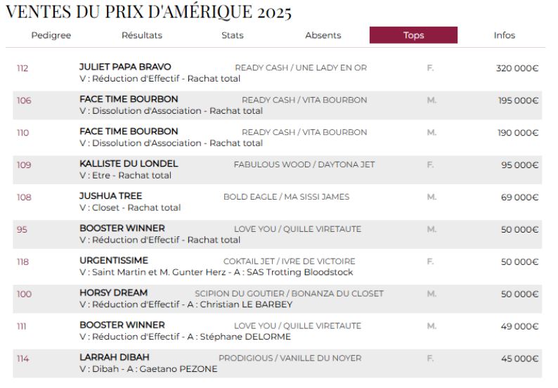The mare Juliet Papa Bravo (6f Ready Cash-Une Lady En Or-Kaidy Dream) was also a no sale at 320,000€ she in foal to Idao de Tillard. The session toppers (sold or not) are shown below.