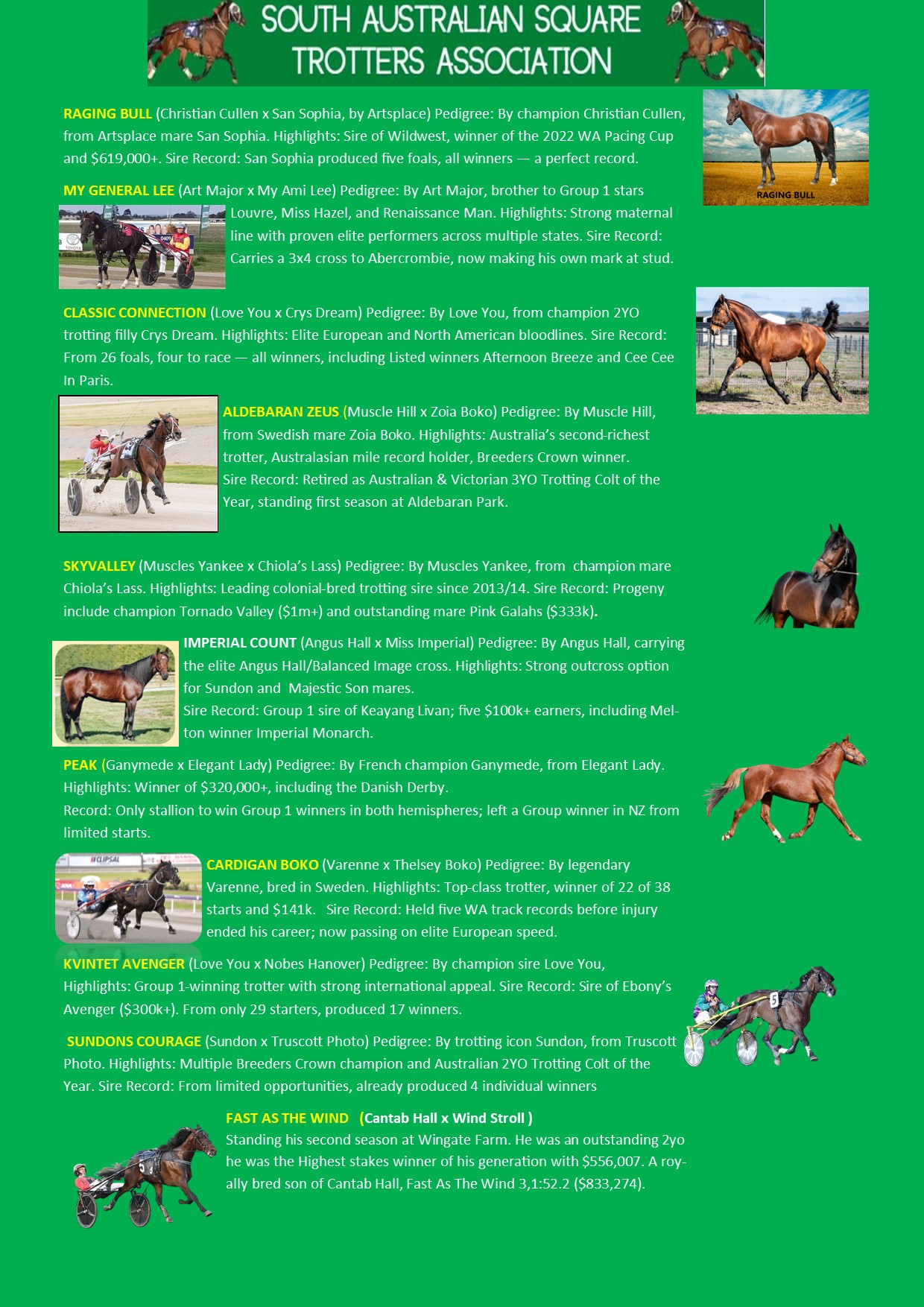 This year’s line-up offers something for every budget, featuring **two exciting pacing sires—Raging Bull and My General Lee—**alongside a strong roster of trotting stallions including Aldebaran Zeus (former 3YO Trotter of the Year), Classic Connection, Fast As The Wind, Skyvalley, Kvintet Avenger, Sundons Courage, Peak, Imperial Count, and Cardigan Boko.