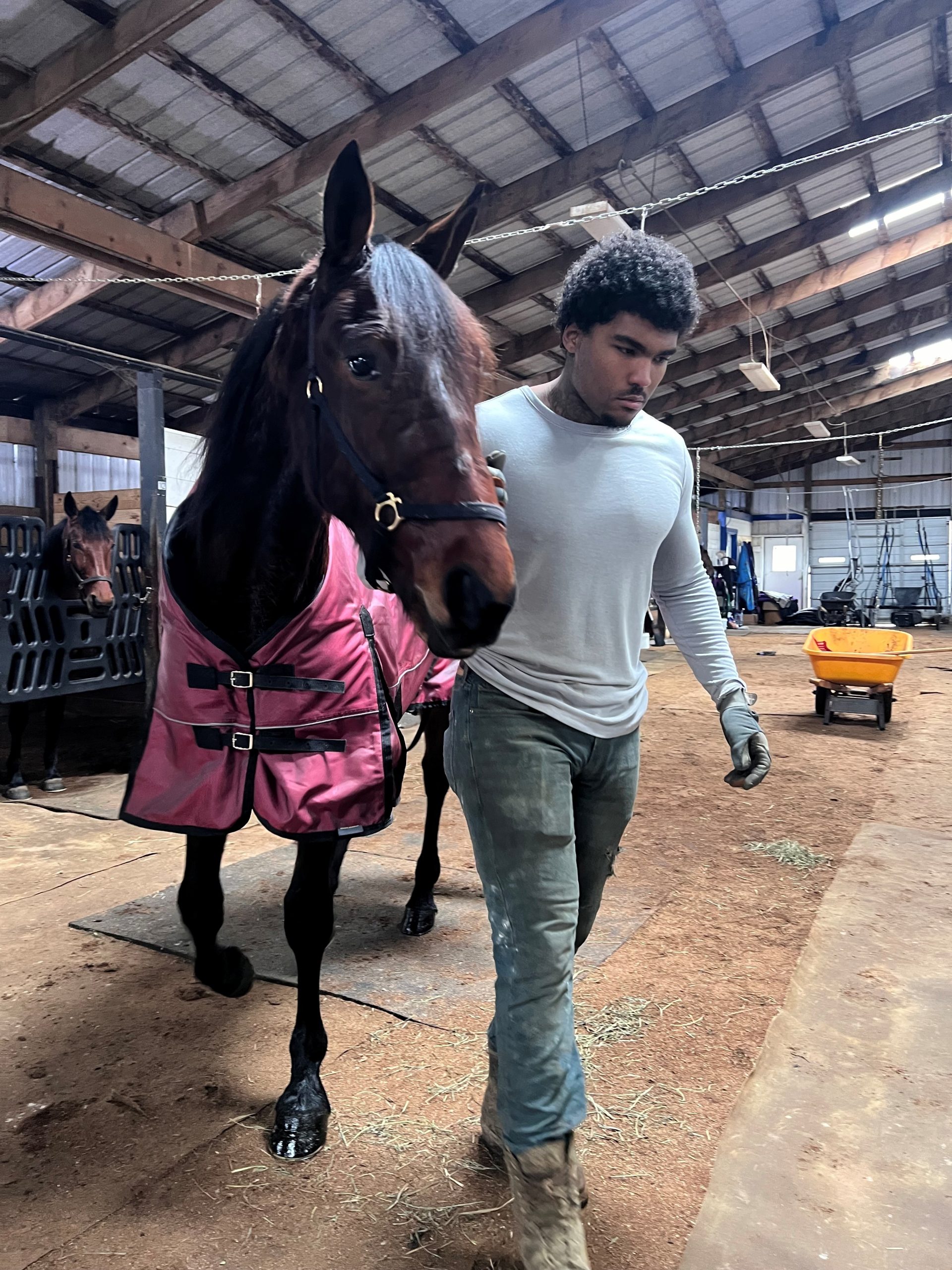 “I was grooming at Northfield Park, but I had two surgeries and I couldn’t do stalls or any heavy lifting for a while, said Boyd. “I didn’t want to quit, so I said, ‘Here you go, come with me and do my stuff.’ He learned fast, and now he loves it. He fits right in.”