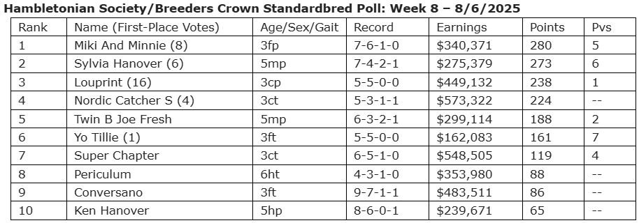 Following an exciting afternoon of harness racing on Hambletonian Day (Aug. 2) at The Meadowlands, nothing remained the same in the Top 10 of the Week 8 edition of the Hambletonian Society/Breeders Crown poll released Wednesday.