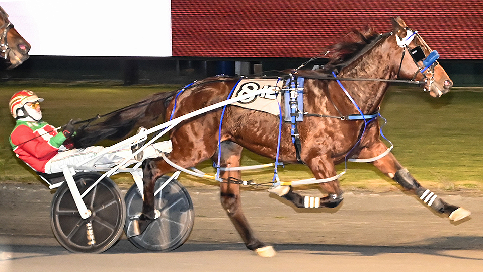 With Jonathan Roberts at the lines for trainer Willard Reynolds, even-money favorite Sheer Terror secured a pocket ride behind Leonard’s Legacy (driven by Tim Deaton) through early splits of :26.3 and :56. As the pace picked up through a :27.2 third quarter thanks to Spring Blake (Russell Foster) applying first-over pressure to Leonard’s Legacy, Sheer Terror tightened in the pocket behind Deaton’s helmet before unleashing his winning move up the open stretch. The 5-year-old Always B Miki-Economy Terror gelding switched into high gear with 100 yards remaining and defeated Leonard’s Legacy by a widening length; Spring Blake finished a game third.