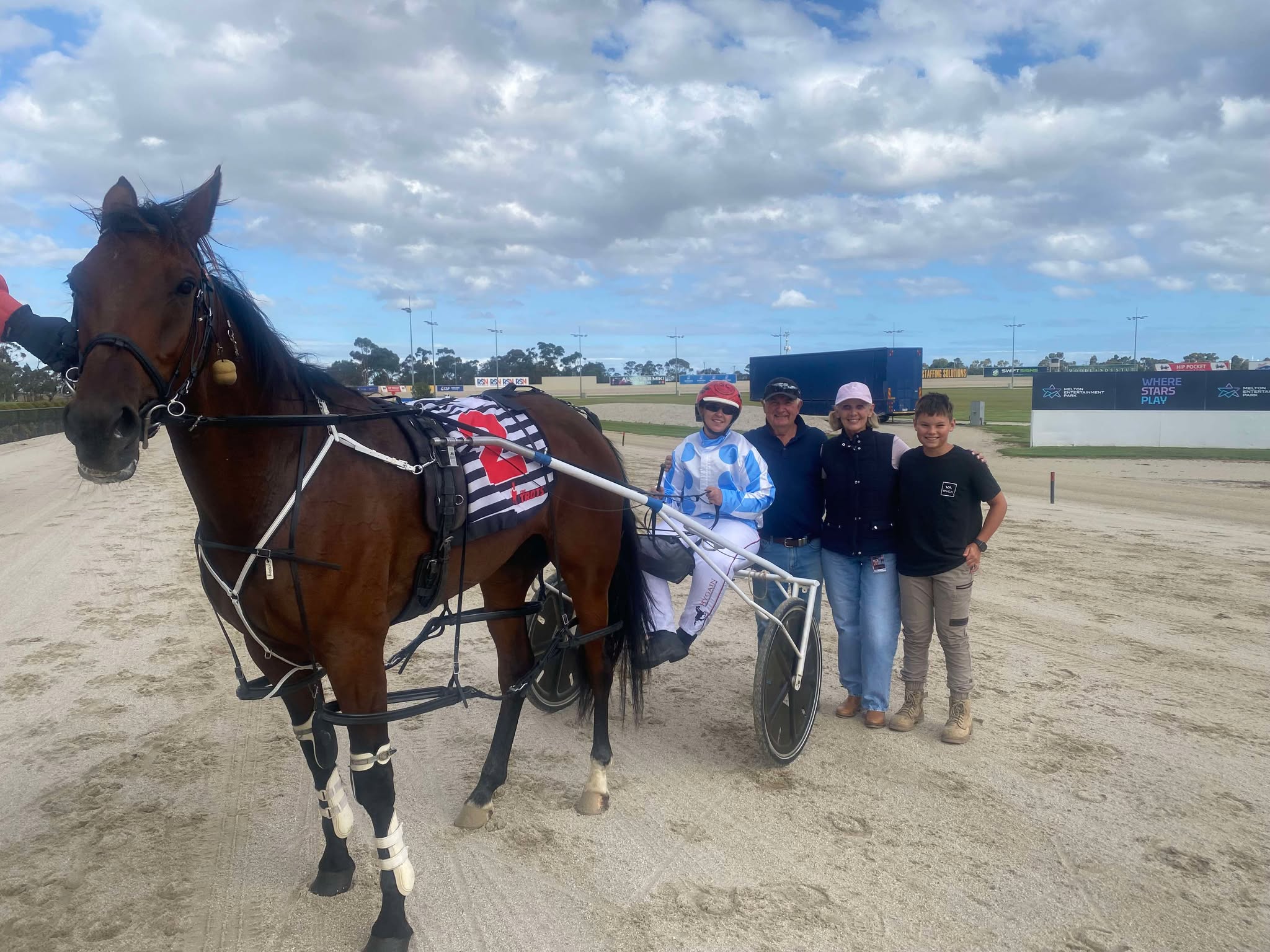 Stacie Carbone celebrates her first driving win with trainer Clive Henderson, his wife Rachel and their grandson Remy Watson (Stuart McCormick Photo)