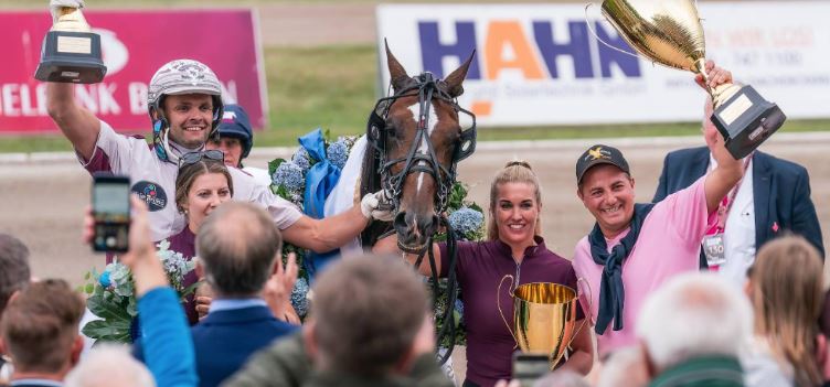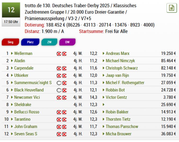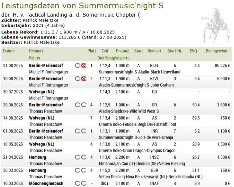 The 130 th Deutsches Traber Derby (purse 188,452€, 1900 meters autostart, 12 four year old harness racing starters) at Berlin Mariendorf went to 1.12.4kr timed Summermusic’night S (4m Tactical Landing-Somermusic’Chapter) reined by Michel F. Rothengatter for breeder/owner Patrick Maleitzke.