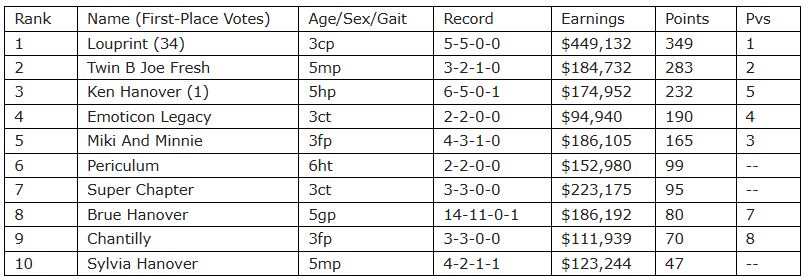 Rankings based on the votes of harness racing media representatives on a 10-9-8-7-6-5-4-3-2-1 basis.