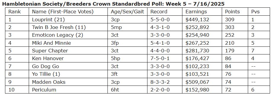 Twin B Joe Fresh pulled within six points of Louprint in the No. 1 spot and three fresh faces joined the Top 10 in the Week 5 harness racing edition of the Hambletonian Society/Breeders Crown poll released Wednesday.