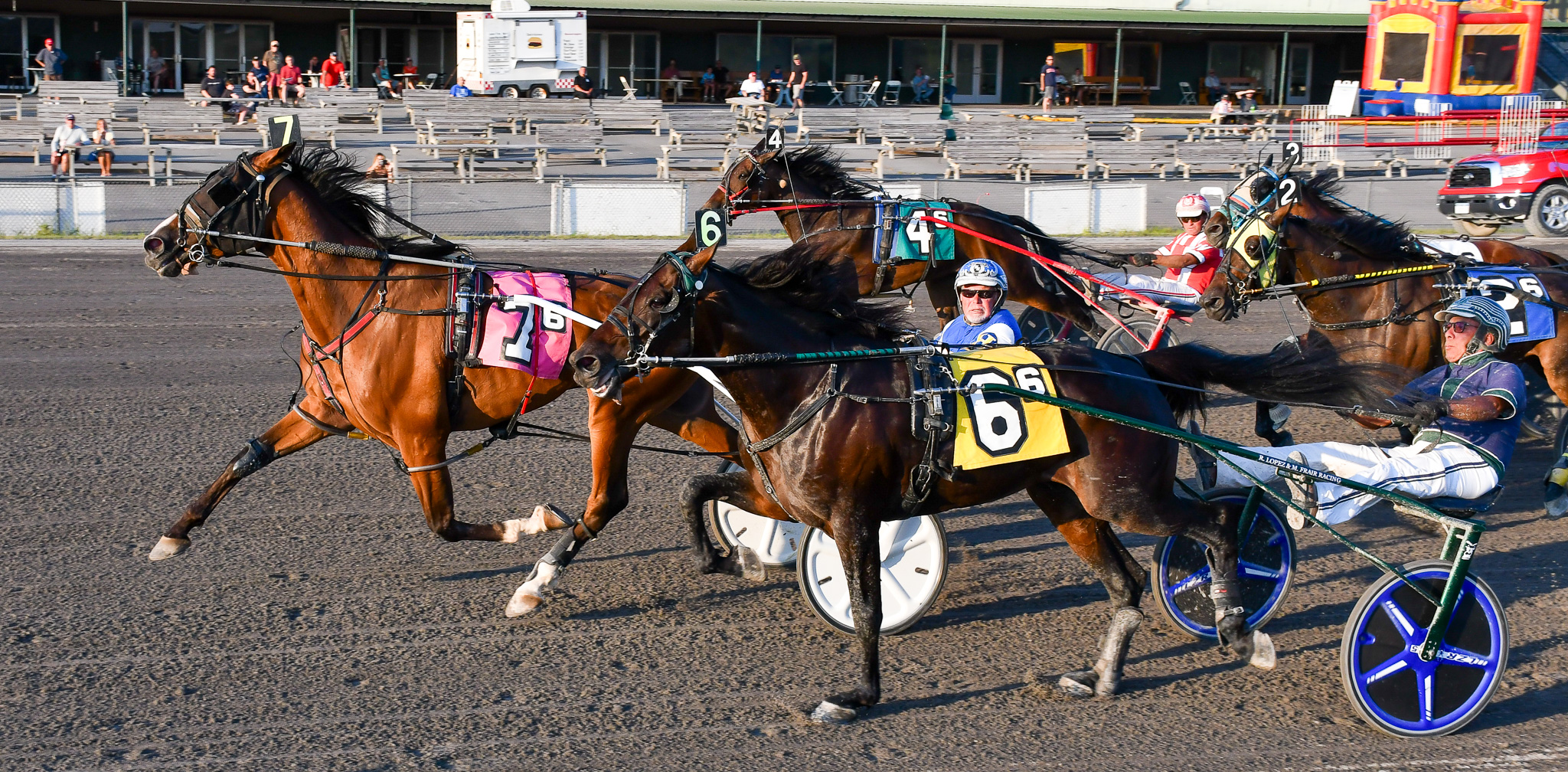 John Horne for Vernon Downs. Dewey Arnold wins Open Trot at Vernon. Dewey Arnold (Ron Harp) hangs on to capture the $8,500 featured Open Trot at Vernon Downs on Friday (August 15). Dewey Arnold ($8,20) was first to the quarter in :27.0. He used a :29.3 second quarter and led to the half in :56.3. Dryden Hanover (Brad Irvine) was first to make a move going first-up as they headed around the final turn. Dewey Arnold was first to three-quarters in 1:26.1. As they reached the stretch second place finisher Forty G’s (Roman Lopez) slipped through on the inside and gave it all he had but Dewey Arnold dug in and won in 1:55.1. Kinnder Hotblood (Jimmy Whittemore) finished third. Dewey Arnold is a 7-year-old gelding by Deweychearumnhowe. He is owned by Phillip Hale and trainer David Dewhurst. It was his sixth win this season. He now has 41 career victories. Ron Harp and Chris Long had driving grand slams. Harp got his other wins with Communion Money, Sunfirewindrain, and Purpose Blue Chip. Long finished first with Sevechic, Crackerjack Prize, Drink On It, and Prospectors Gold. Vernon Downs returns to live racing on Saturday (August 16) with a post time of 5:05 p.m. For more information go to www.vernondowns.com<www.vernondowns.com>. Fotowon photo.